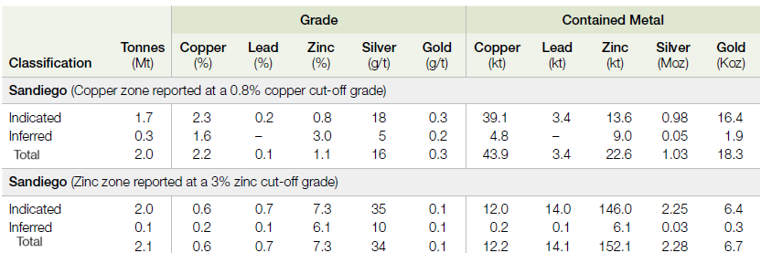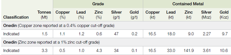 4.8Mt at 0.7% Cu, 1.1% Pb, 3.1% Zn and 38g/t Ag for 33kt contained copper, 51kt lead, 151kt zinc and 5.9Moz silver.