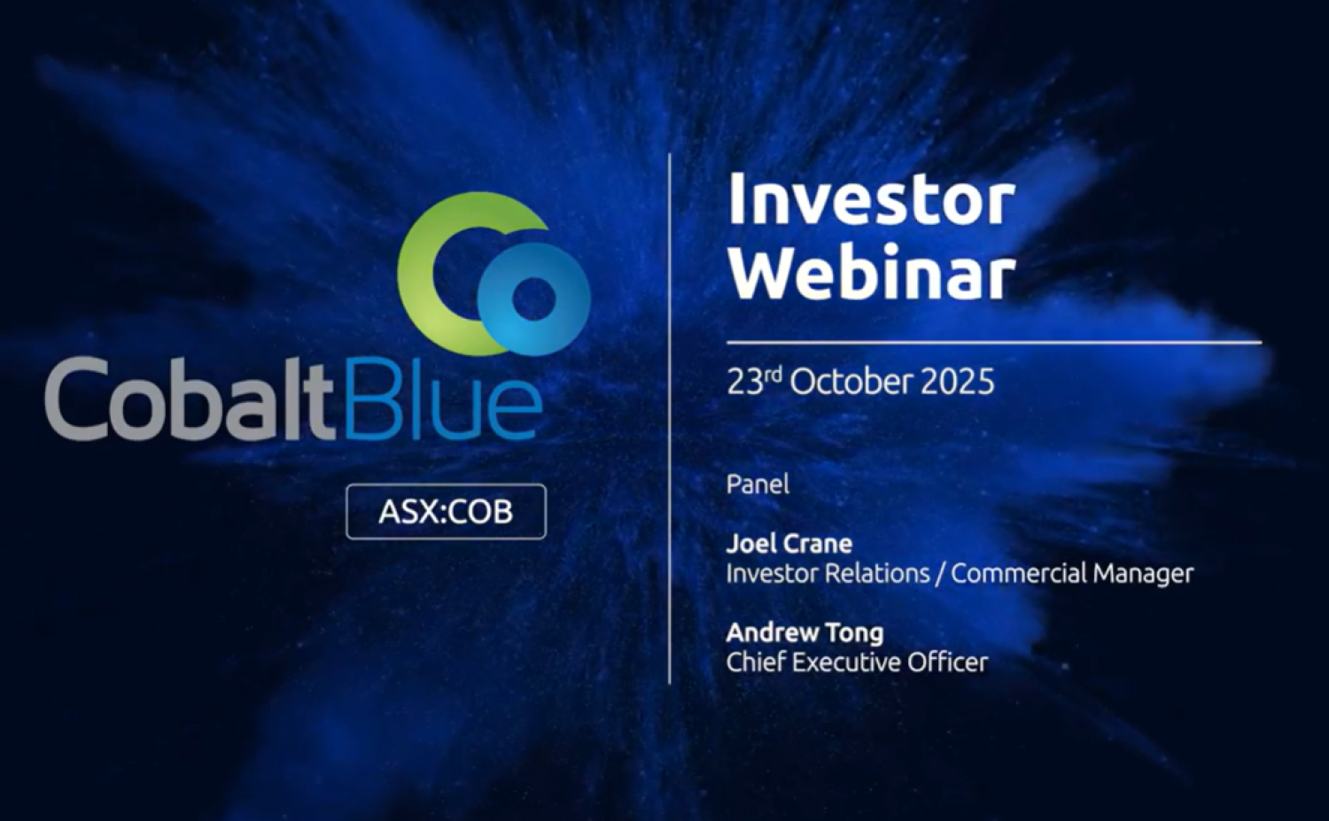 CEO Dr Andrew Tong and Investor Relations & Commercial Manager Joel Crane hosted a live webinar to discuss the current challenges and emerging solutions in the cobalt market, Cobalt Blue’s role in addressing these issues, and to provide updates on the Kwinana Cobalt Refinery and other key business developments.